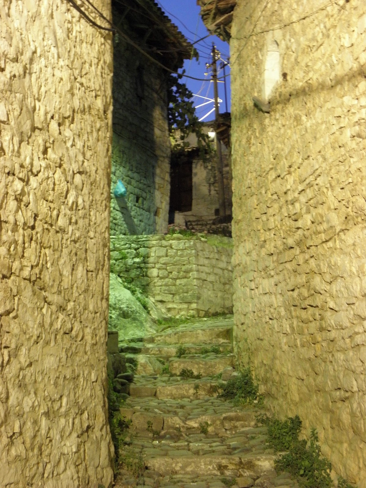 Die Besichtigung der Stadt beginnen wir mit der Besteigung der Festung und Altstadt Kalaja. Unterwegs sehen wir die Junggesellen- und Königsmoschee sowie das Ethnographische Museum, das sich in einem alten albanischen Haus befindet. Hinauf führt eine steile, rutschige Straße. Der Eintritt in die Festung kostet 100 Lek (0,75 Euro). Um sie herum verläuft eine Stadtmauer, innerhalb der sich Fragmente der historischen Gebäude, die aus den Herrschaftszeiten der Illyrer bis zu den Türken stammen, sowie noch bewohnte Häuser befinden. Wir machen einen Spaziergang durch die Altstadt. Ich rate acht zu geben, wo man hintritt, da die Kanaldeckel fehlen. Unterwegs sehen wir die orthodoxe Kirche des Hl. Theodor, die sich zur Hälfte unter der Erde verbirgt, sowie das Onufri Museum, das die Ikonen des gleichnamigen und bedeutenden albanischen Malers beherbergt und sich in der alten orthodoxen Marienkirche befindet. Wir finden noch ein wenig Zeit, um uns die Ausstellung sowie das Interieur anzusehen. Der Eintritt kostet 200 Lek (1,50 Euro). Wir kommen zur orthodoxen Kirche der Dreifaltigkeit, die regelrecht an der Mauer der türkischen Zitadelle pickt. Am Rückweg gehen wir an der Weißen und Roten Moschee vorbei, wobei bei der zweiten nur das Minarett erhalten geblieben ist. Als wir wieder hinunter kommen, ist es schon dunkel. Unser Weg zurück zum Hostel führt uns über die beleuchteten, kleinen Gassen der Stadtteile Mangalem und Gorica.
