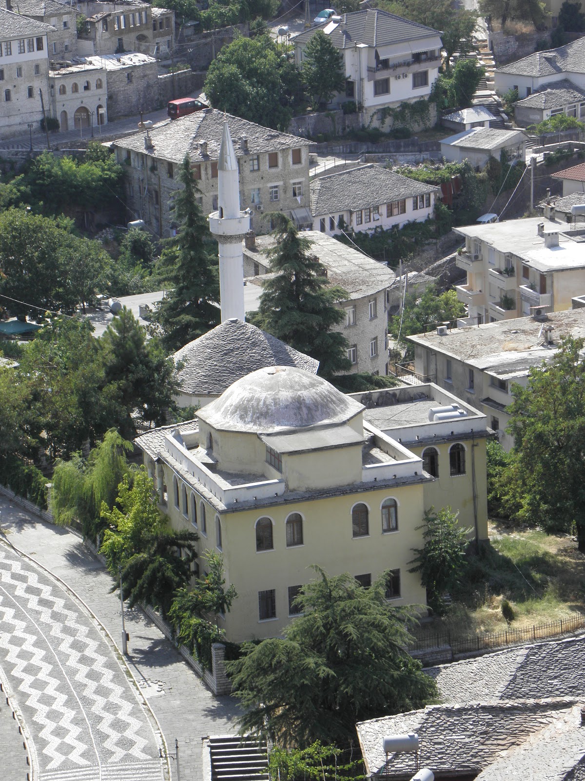 Nach der Ankunft versuchen wir zur Festung zu kommen, jedoch können wir den richtigen Weg nicht finden. Somit entscheiden wir uns einen Spaziergang durch die historische Altstadt zu machen, um die mit grauem Dachschiefer bedeckten Häuser von der Nähe bestaunen zu können. Ihnen verdankt Gjirokastra, die auf die Liste der UNESCO aufgenommen wurde, den Namen "Silberne Stadt". Wir gehen an einer Moschee aus dem XVII Jahrhundert vorbei und begeben uns weiter zu einer kleinen, runden Aussichtsplatform, von der man einen sehr guten Ausblick auf die Stadt hat.